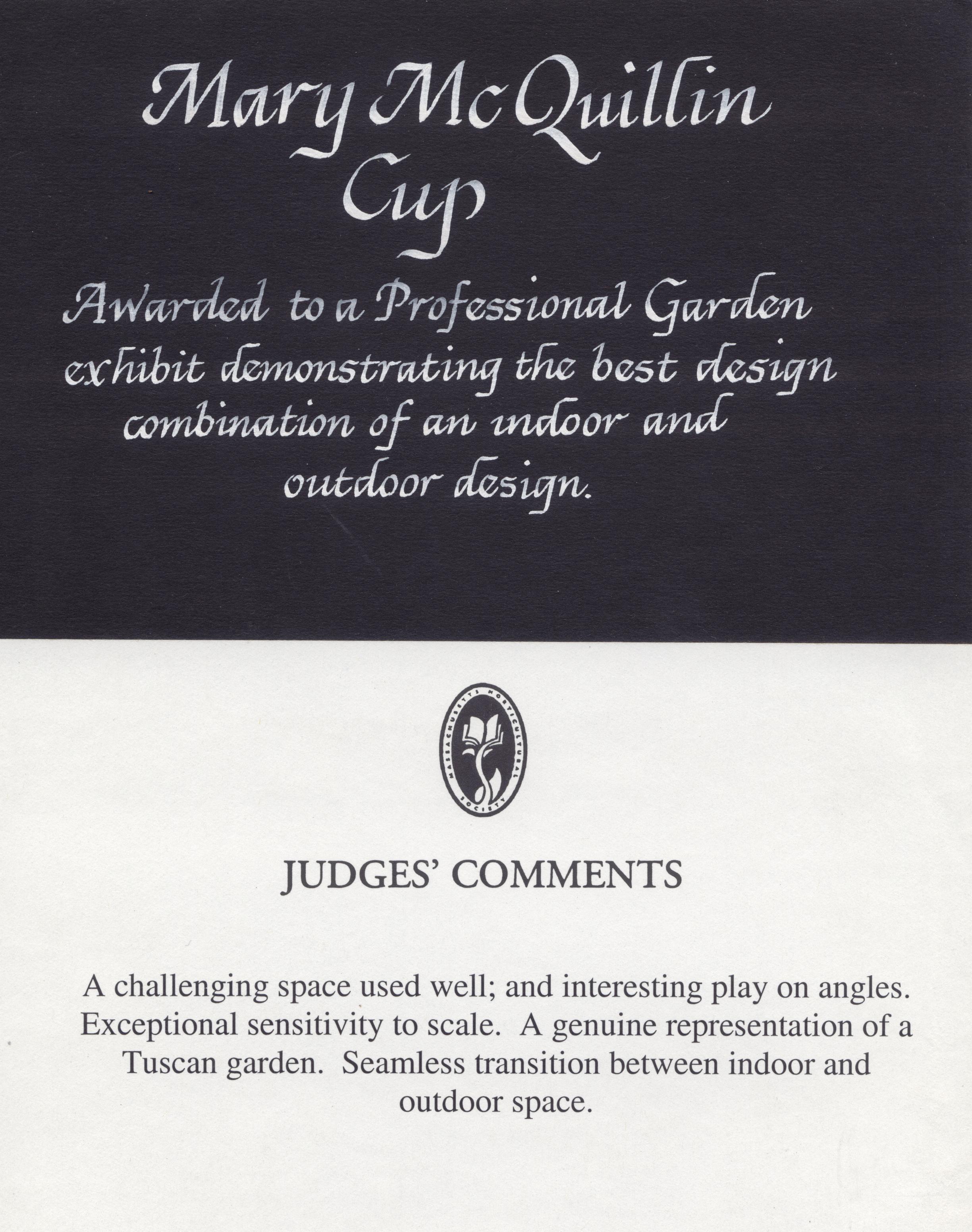 Florentine Renaissance Masonry was awarded the Mary Mc. Quilling Cup