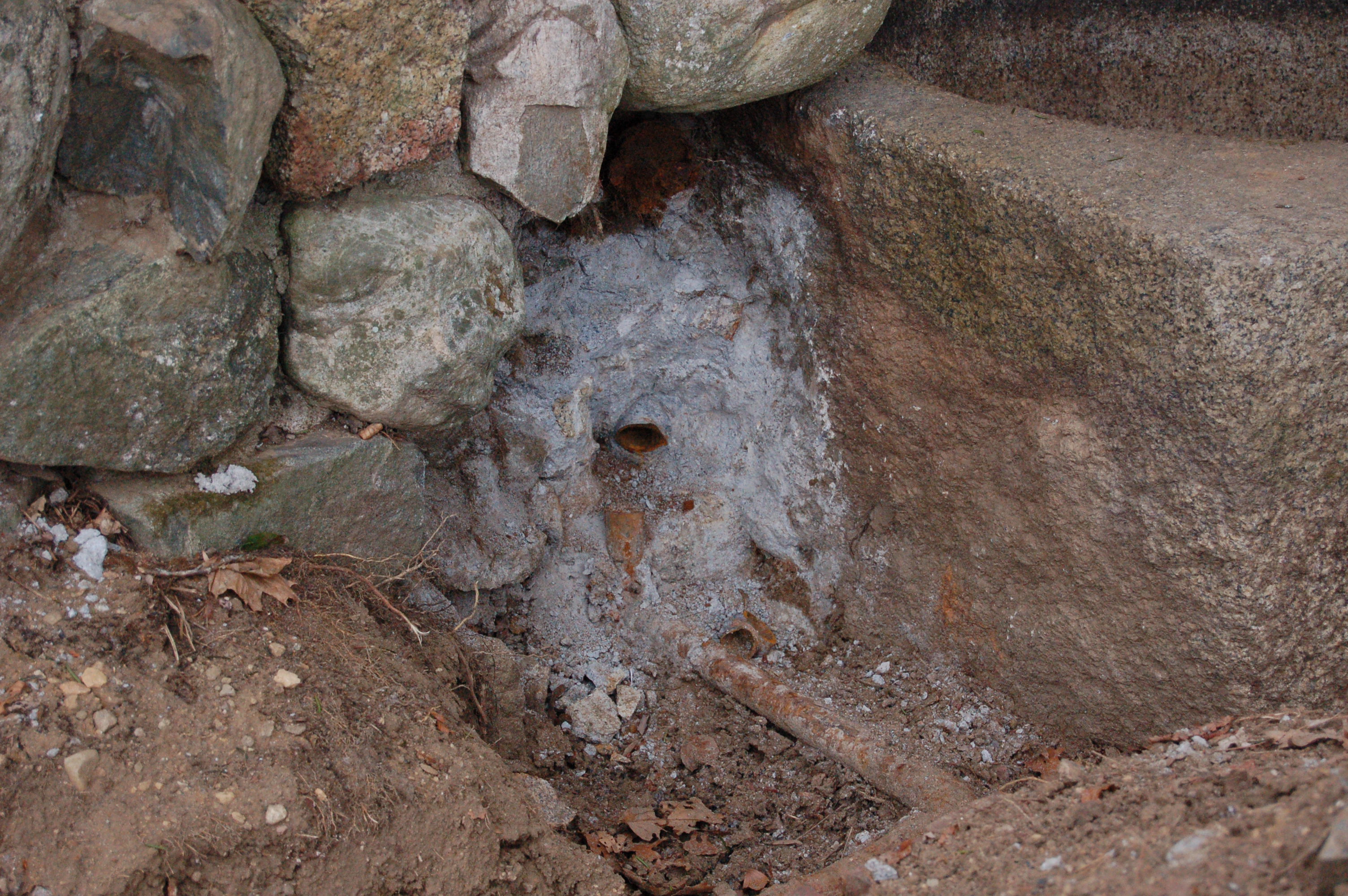 A trench has been dug for the piping transporting the water to the remote filter and back in the pond. The filter will be located outside the garden on the other side of the perimeter wall. While the concrete of the pond was curing all the soil and roots from behind the fountain were dug out and the loose interior of the wall was taken out until stucturally sound mortar was encountered. A few photos were taken for reference and the original stones organized for putting it all back together as close to the original as possible. Some stones disintegrated and were replaced with indigenous stones.