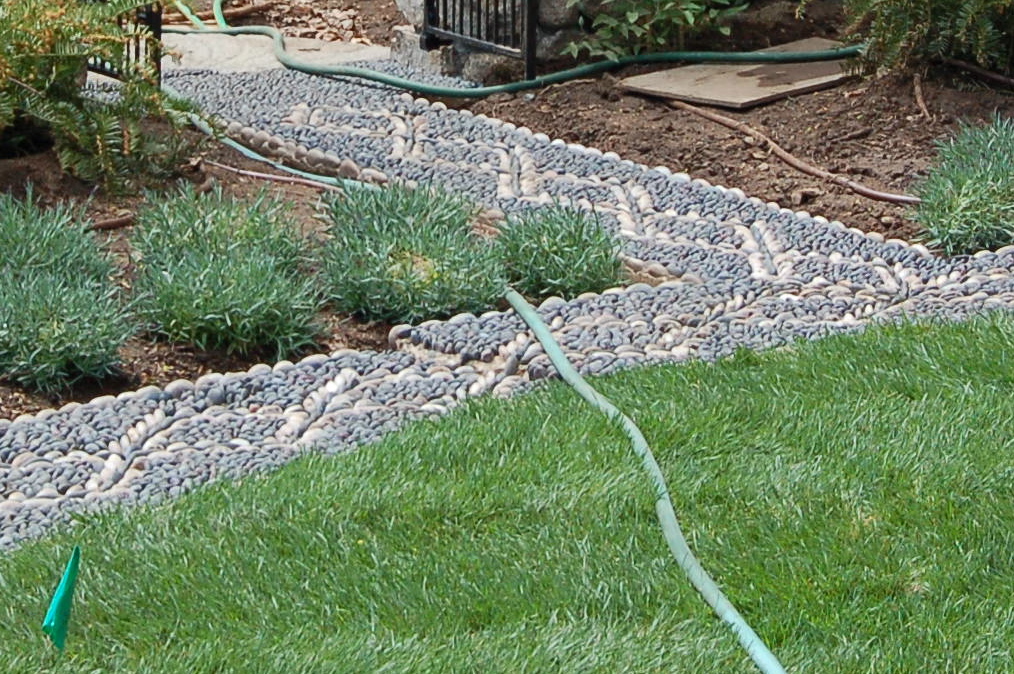 The restoration of the path was next. I cleaned all growth and dirt from the pebble path and found many of the original pebbles buried in the soil on either side of the path. I scavanged for some closely matching pebbles as well to replace what was missing.