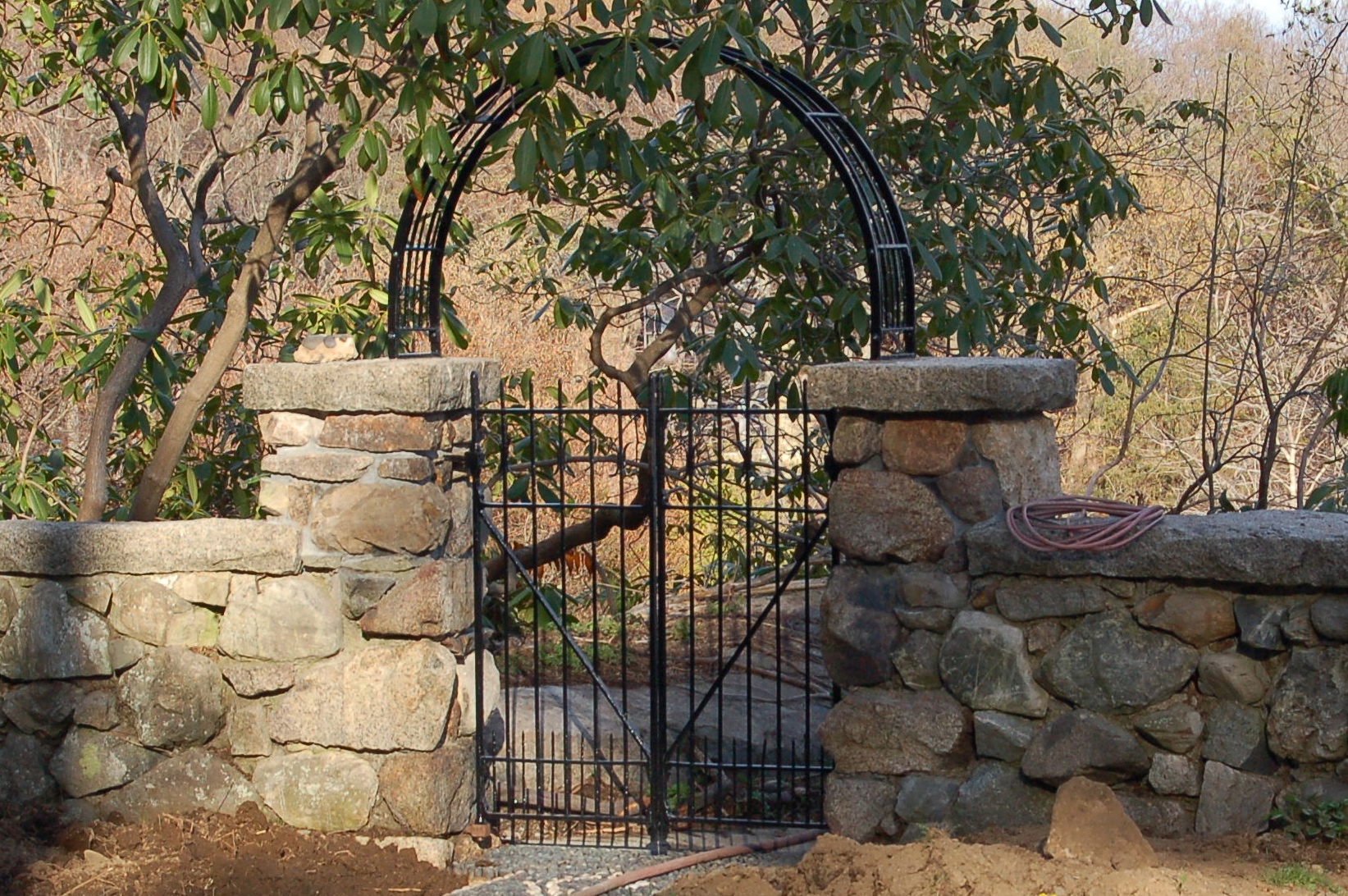 Completely overgrown, the masonry had suffered from years of neglect. A large tree root at the left of the west gate had grown under the wall lifting it and tilting the column offsetting the left side gate. The two arbors rusted out at their base and had fallen off and were all bent and out of shape.