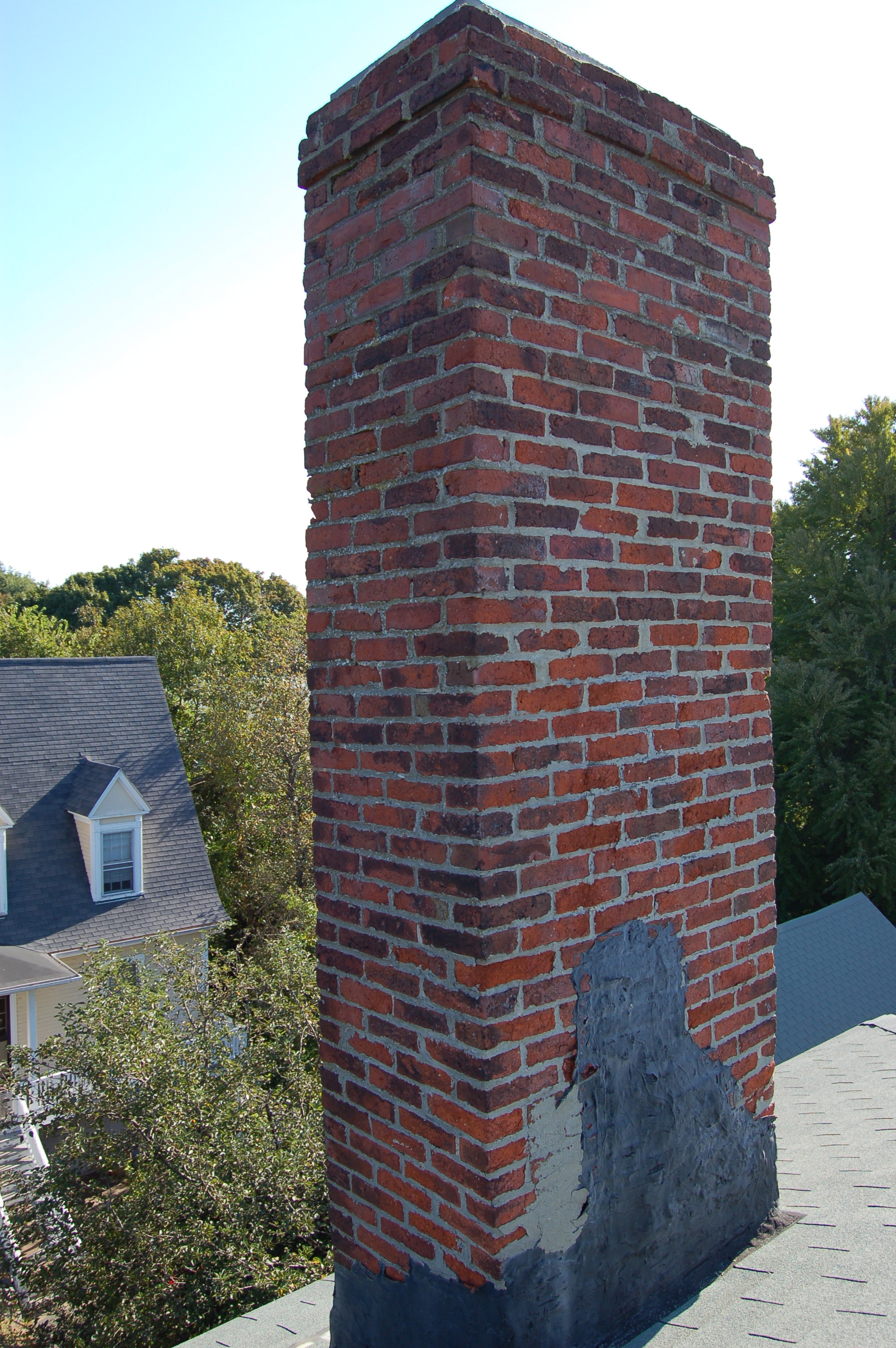 The two original chimneys of this private home in the McIntire Historic District of Salem, MA. were originally built with soft fired brick and lime putty mortar. Soon after the recent repairs performed with Portland cement the chimneys started leaking water into the house ceilings and walls. From a distance the chimneys do not look all too bad however a closer look reveals a different picture.